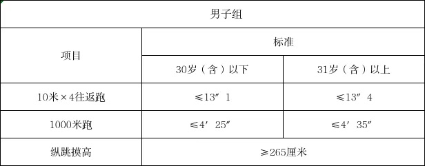 體(tǐ)能(néng)測試科(kē)目共三項,為(wèi)縱跳(tiào)摸高(gāo)、4×10米往返跑、男(nán)子(zǐ)1000米跑。成績評定采用(yòng)達标制(zh↓ì),任意一(yī)項不(bù)達标的(de)取消進入下(xià)一(yī)環節資格。