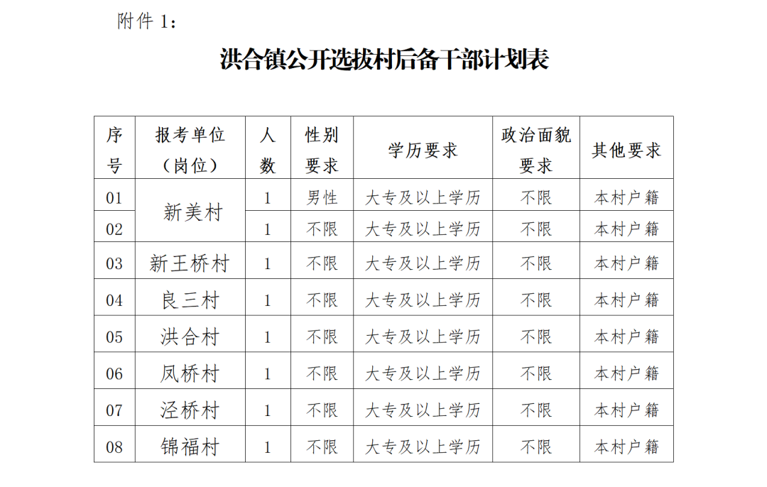 洪合鎮人(rén)民(mín)政府計(jì)劃選拔村(cūn)後備幹部8名,具體(tǐ)的(de)崗位、人∑(rén)數(shù)和(hé)資格條件(jiàn)詳見(jiàn)《洪合鎮公開(kāi)選拔村(cūn©)後備幹部計(jì)劃表》(見(jiàn)附件(jiàn)1)。