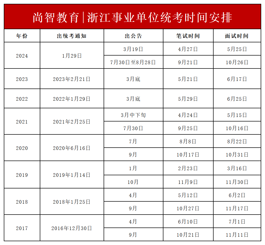 根據往年(nián)情況,在每年(nián)年(nián)初,浙江省人(rén)事(shì)考試院會(huì)發布《關于 做(zuò)好(hǎo)X年(nián)度事(shì)業(yè)單位統一(yī)公開(kāi)招聘人(rén)員(yuán)考試≈考務工(gōng)作(zuò)的(de)通(tōng)知(zhī)》,公布本年(nián)度事(shì)業(yè)單位考試時(÷shí)間(jiān)、大(dà)綱等事(shì)項。