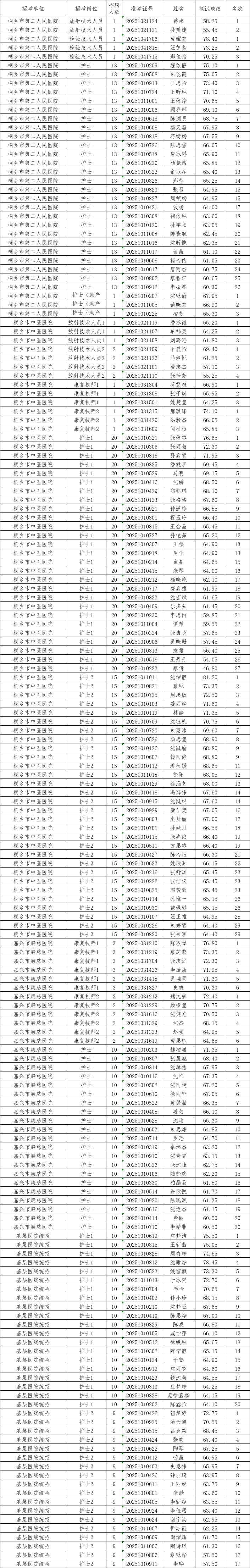 2025年(nián)桐鄉(xiāng)市(shì)衛生(shēng)健康局下(xià)屬部分(fēn)醫(yī)療衛生(shēng)單位©招聘編外(wài)合同人(rén)員(yuán)筆(bǐ)試成績已公布,根據《2025年(nián)桐鄉(xiāng)市(shì)衛生(∏shēng)健康局下(xià)屬部分(fēn)醫(yī)療衛生(shēng)單位招聘編外(wài)合同人(rén)員(yuán)公告》規定,結合各崗位招考計(jì≤)劃和(hé)報(bào)考人(rén)員(yuán)筆(bǐ)試成績,從(cóng)高(gāo)分(fēn)到(dào)低(dī)分(fēn)按1:3(招考計(jì)劃3名及以上(shàng)的(de)職位按1:2)确定面試對(duì)象。入圍面試人(☆rén)數(shù)不(bù)足1:3或1:2的(de),參加筆(bǐ)試人(rén)員(yuán)(筆(bǐ)試缺考、零分(fēn)除外(wài))全部列入面試對(duì)象。現(x¥iàn)将入圍面試人(rén)員(yuán)名單予以公布。