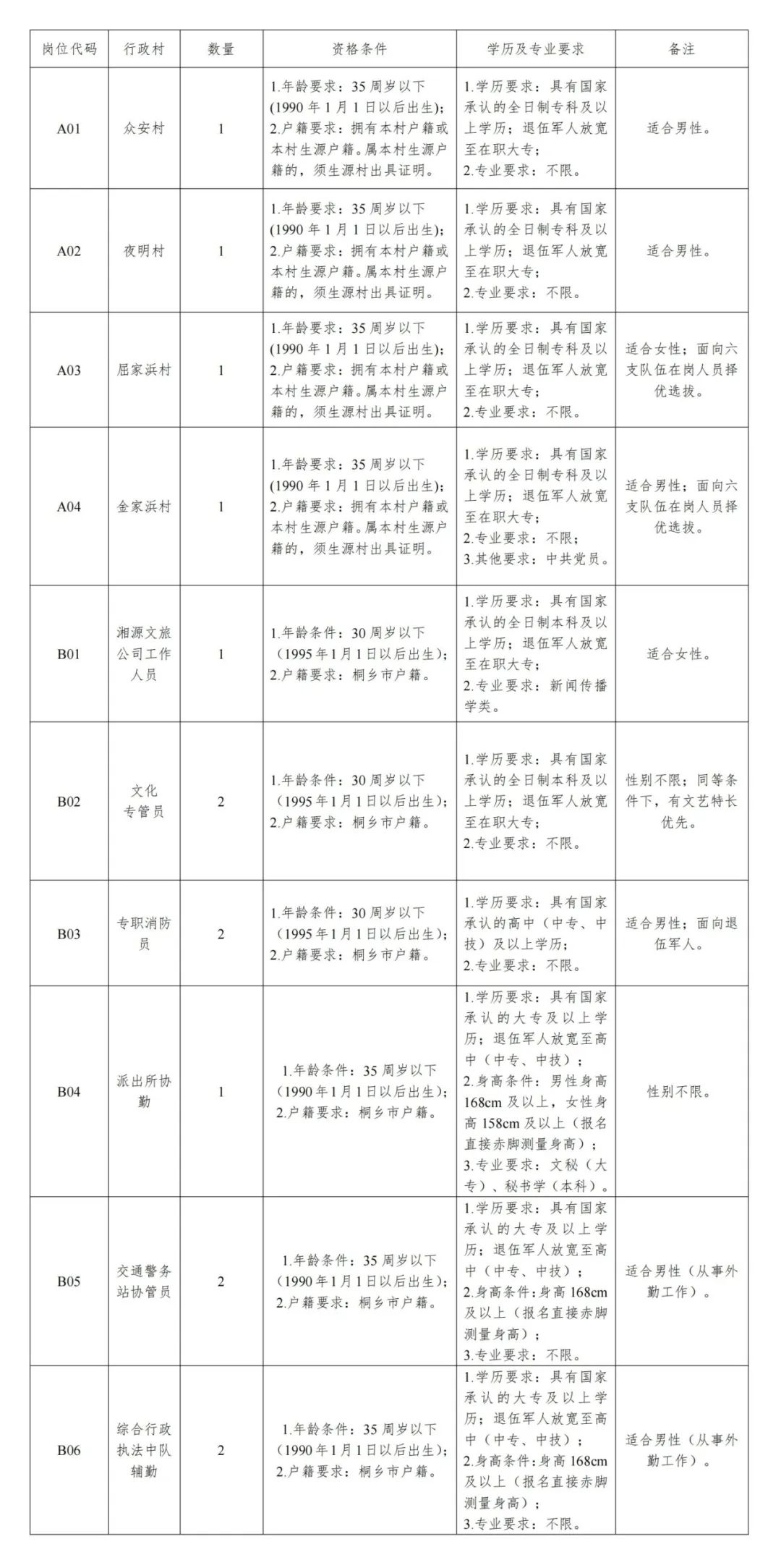 本次招考行(xíng)政村(cūn)後備幹部4名,湘源文(wén)旅公司工(gōng)作(zuò)人(rén)員(yuán)1名,文(wén)化(huà)±專管員(yuán)2名,專職消防員(yuán)2名,派出所協勤1名,交通(tōng)警務站(zhàn)協管員(yuán)2名,綜合行(xíng)政執法中隊輔勤2名。