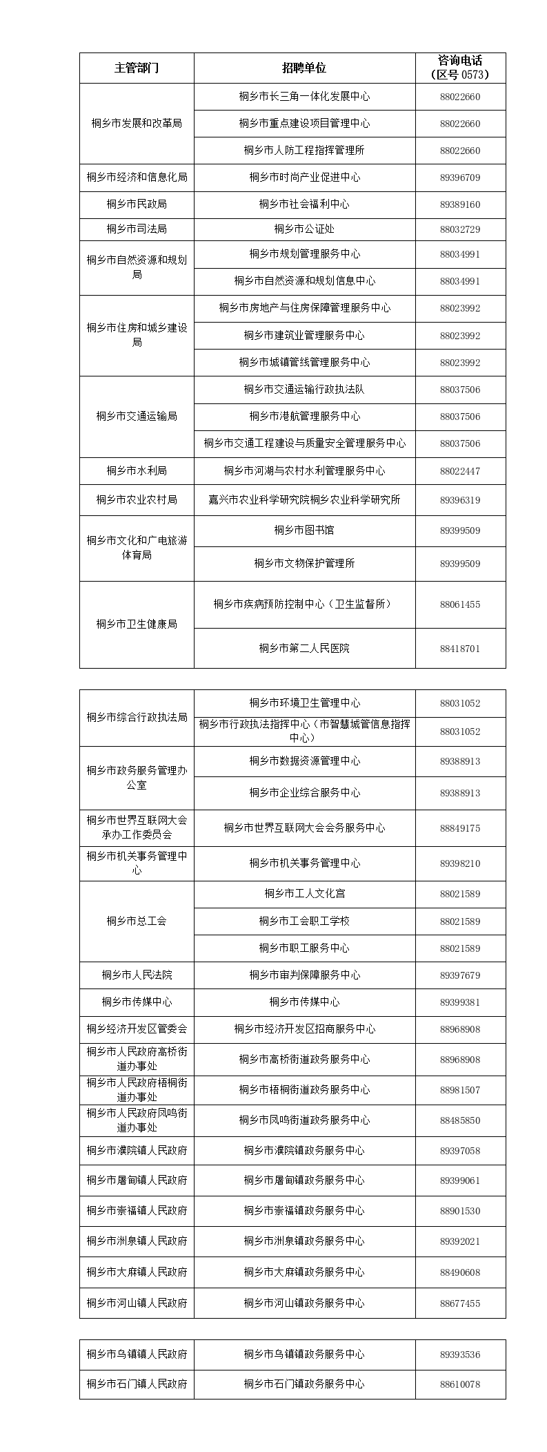 | 38 | 桐鄉(xiāng)市(shì)企業(yè)綜合服務中心 | 公益一(yī)類 | 8038 | 企業(yè)綜合服務 | 1 | 1:3 | 專技(jì)崗位 | 專技(jì)12級及以下(xià) | 本科(kē) | 學士 | 工(gōng)程管理(lǐ)、漢語言文(wén)學專業(yè) | 嘉興市(shì) | 0573-89388913 | ||||