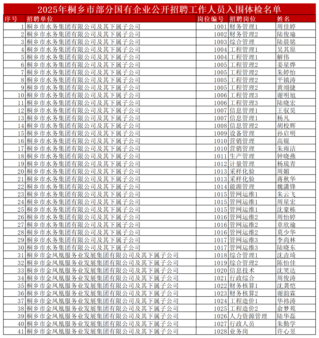 2025年(nián)桐鄉(xiāng)市(shì)部分(fēn)國(guó)有(yǒu)企業(yè)公開(kāi)招聘工(gōng)作(zuò)人(rén)員(σyuán)筆(bǐ)試、面試工(gōng)作(zuò)已全部結束,現(xiàn)将總成績(附件(jià✔n)1)及入圍體(tǐ)檢人(rén)員(yuán)名單(附件(jiàn)2)予以公布。