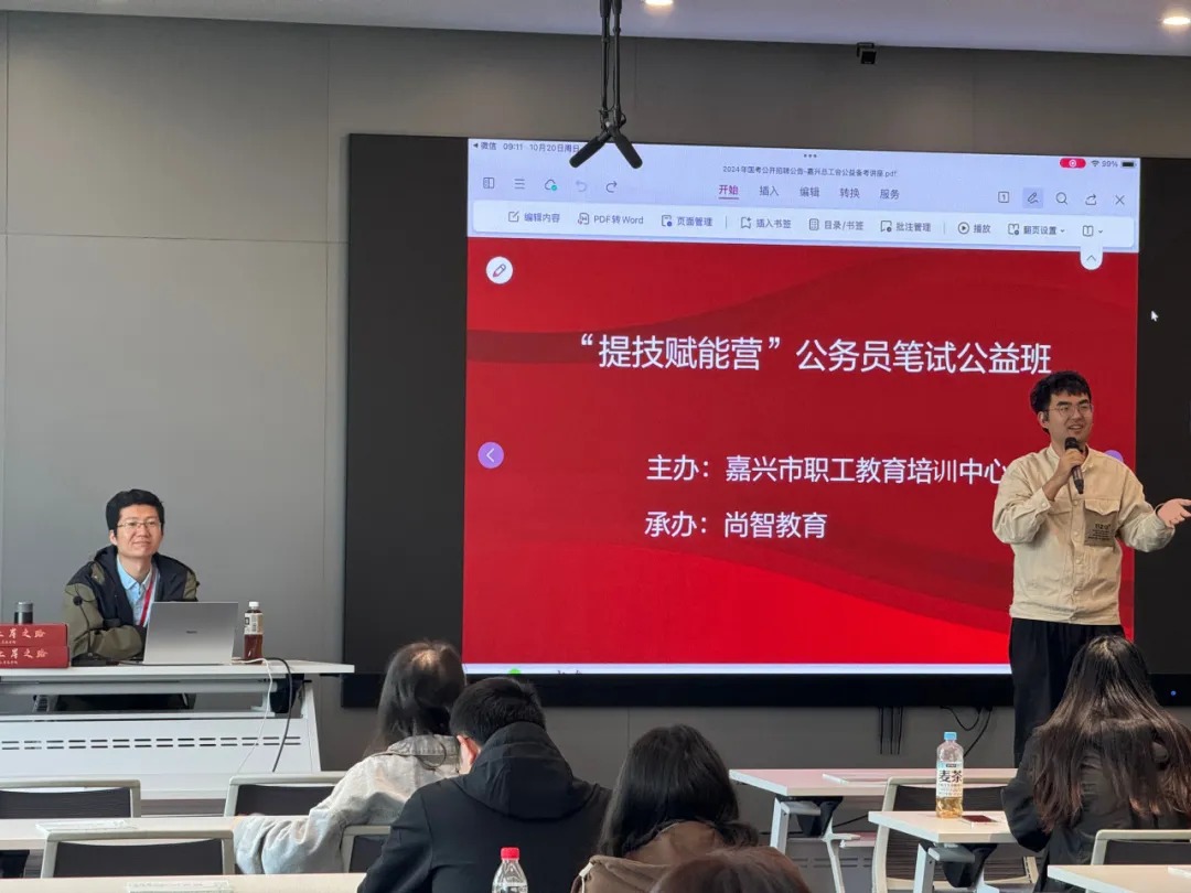 為(wèi)助力廣大(dà)考生(shēng)備戰 2025 年(nián)公務員(yuán)考試,∑提升應考能(néng)力,10月(yuè)20日(rì),由嘉興市(shì)總工(gōng)會(huì)職工(gōng)教育培訓中心主辦、尚智教育承辦的(de)公務員(yuán)考試公益講座在嘉興市(shì)黨群服務中心順利舉行(xíng)。
