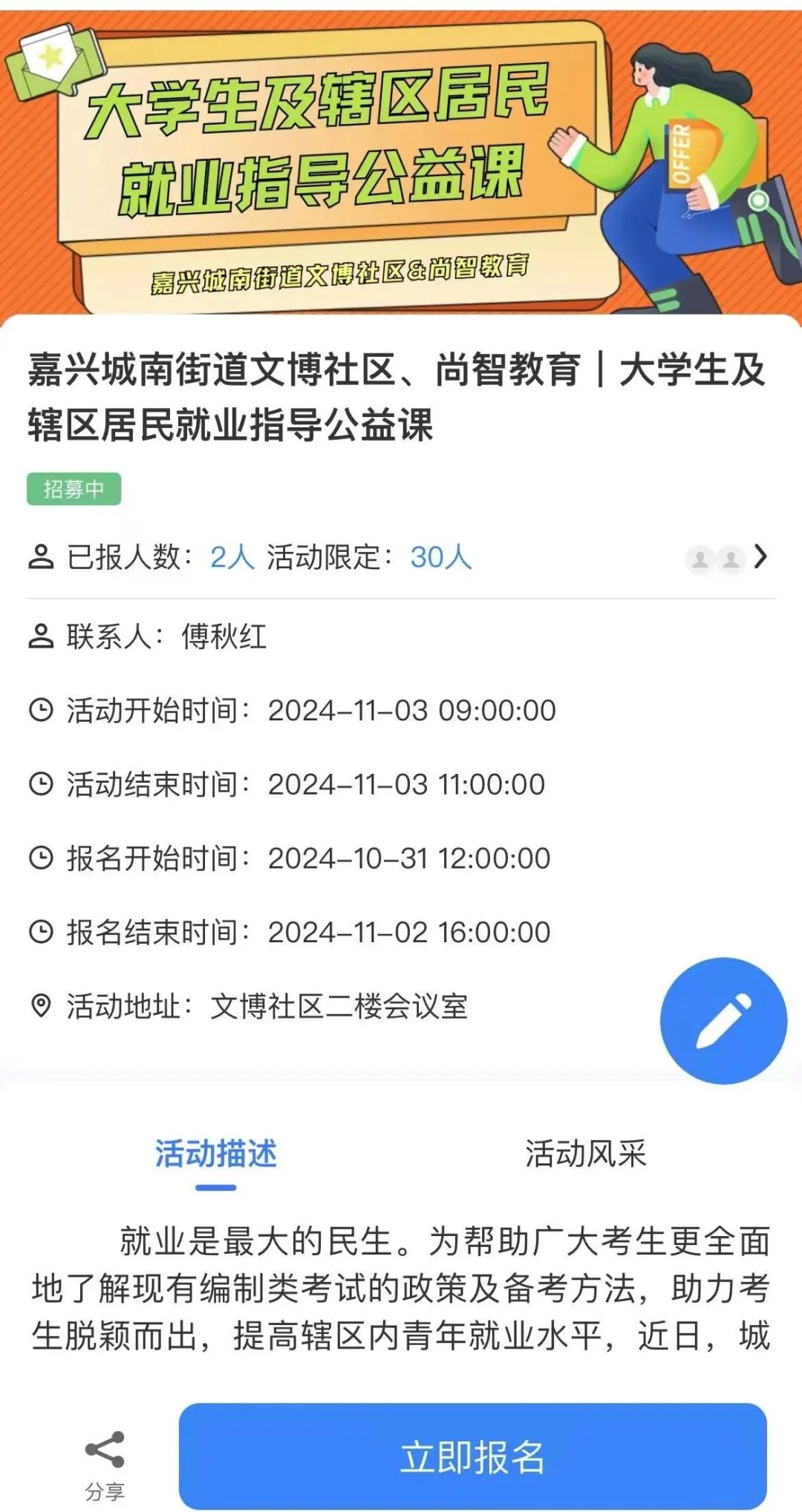報(bào)名方式(請(qǐng)點擊後面鏈接):嘉興城(chéng)南(nán)街(jiē)道(dào)文(wén)博社區(qū)、尚智教育 | 大(dà)學生(shēng)及轄區(qū)居民(mín)就(jiù)業(yè)€指導公益課