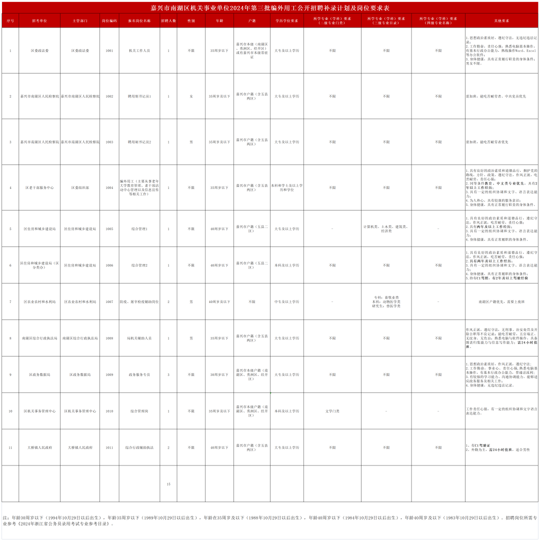 嘉興市(shì)南(nán)湖(hú)區(qū)下(xià)屬機(jī)關事(shì)業(yè)單位2024年(nián)第三批編外(wài™)用(yòng)工(gōng)公開(kāi)招聘工(gōng)作(zuò)人(rén)員(yuán)15名。具體(tǐ)招聘單位、崗位、人(rén)數(shù)和(hé)資格條件(ji'àn)等詳見(jiàn)《嘉興市(shì)南(nán)湖(hú)區(qū)機(jī)關事(shì)業(yè)單位2024年(nián)第•三批編外(wài)用(yòng)工(gōng)公開(kāi)招聘計(jì)劃及崗位要(yào)求表》(以下(&xià)簡稱《計(jì)劃及崗位要(yào)求表》),具體(tǐ)詳見(jiàn)附件(jiàn)1。