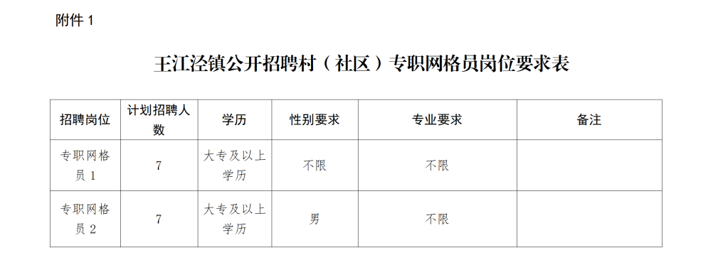 王江泾鎮公開(kāi)招聘村(cūn)(社區(qū))專職網格員(yuán)14名,具體(tǐ)崗位、人(rén)數(shù)和(hé)崗位要(☆yào)求詳見(jiàn)鎮(街(jiē)道(dào))招聘公告(詳見(jiàn)附件(jiàn))。