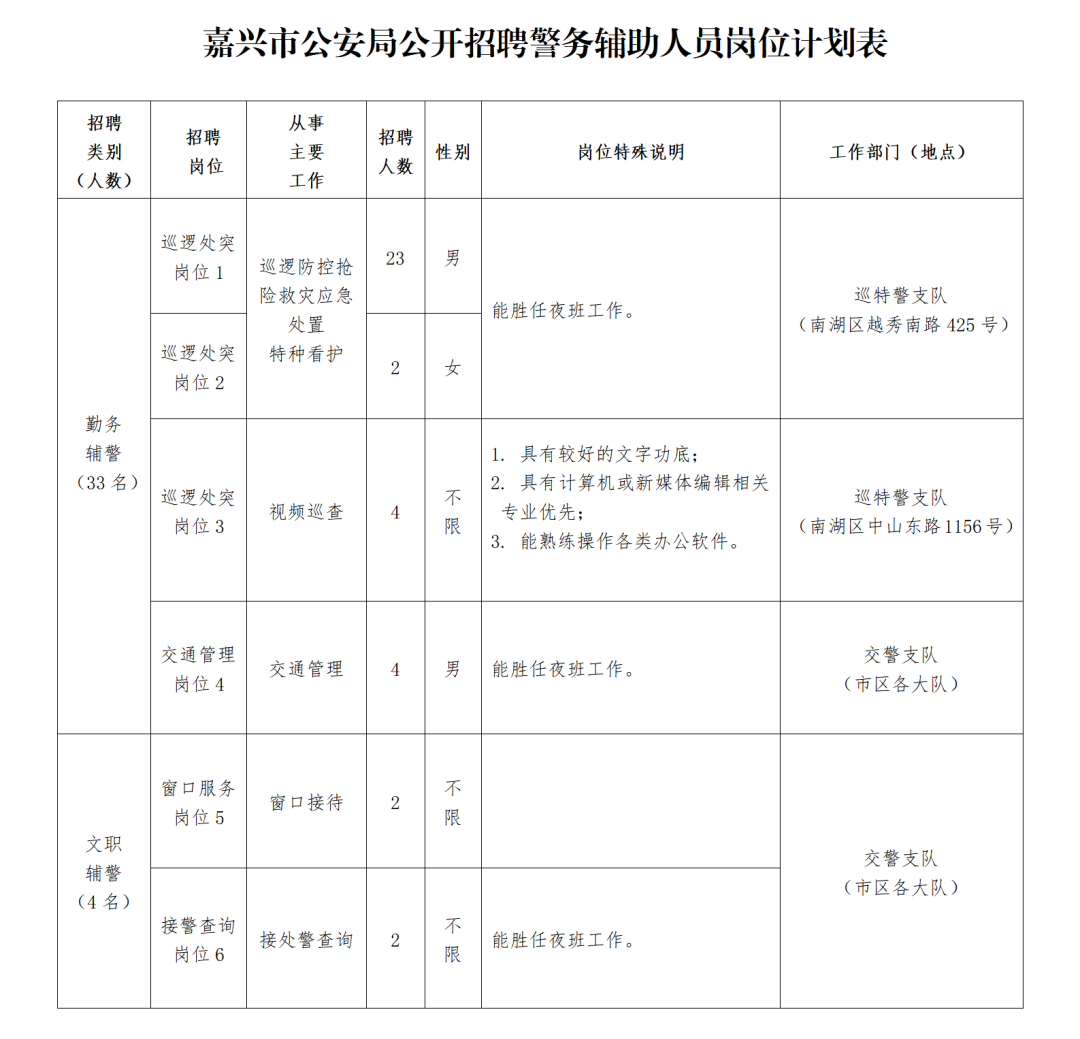 本次計(jì)劃面向社會(huì)公開(kāi)招聘輔警37名。崗位名稱、招聘人(rén)數(shù)及具體(tǐ)崗位要(yào)求詳見(jiàn)《嘉興市(shì)公安局公λ開(kāi)招聘警務輔助人(rén)員(yuán)崗位計(jì)劃表》(附件(jiàn)1)。