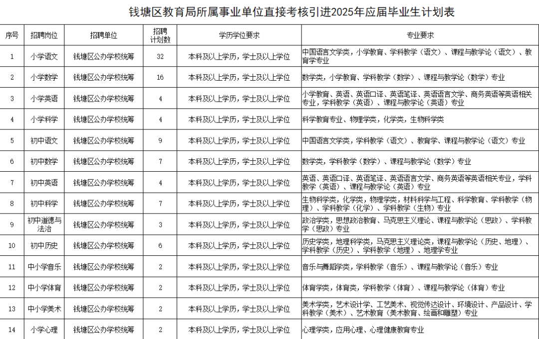 根據工(gōng)作(zuò)需要(yào),杭州錢(qián)塘區(qū)教育系統公辦中小(xiǎo)學面向2025年(nián)本科(kē)及以上(shàng)優秀應屆畢<業(yè)生(shēng)公開(kāi)招聘事(shì)業(yè)編制(zhì)教師(shī)100名。此次招聘采用(yòng)直接考核引進方式♦,招聘錄用(yòng)的(de)人(rén)員(yuán)均為(wèi)财政補助事(shì)業(yè)單位公辦教師(shī)。