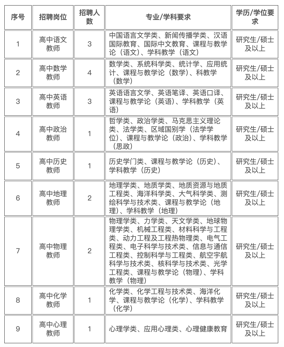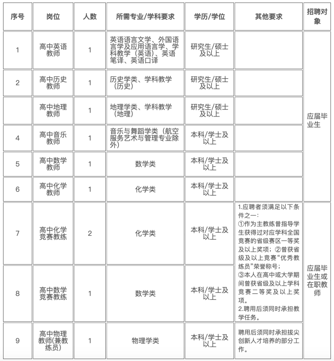 本次公開(kāi)招聘推出崗位9個(gè),計(jì)劃招聘教師(shī)10名。具體(tǐ)的(de)招聘崗位、人(rén)數(shù)和(hé)資格條件(j®iàn)如(rú)下(xià):