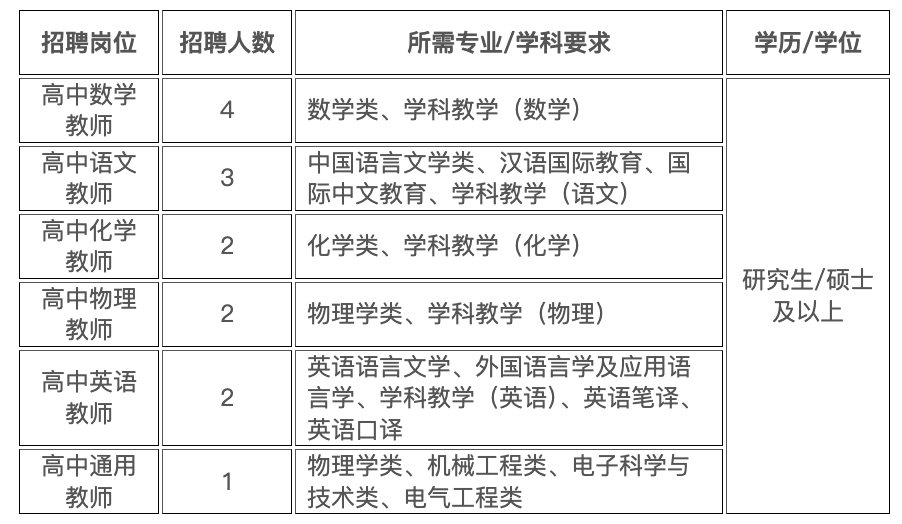 本次公開(kāi)招聘推出崗位6個(gè),計(jì)劃招聘教師(shī)14名。具體(tǐ)的(de)₩招聘崗位、人(rén)數(shù)和(hé)資格條件(jiàn)如(rú)下(xià):