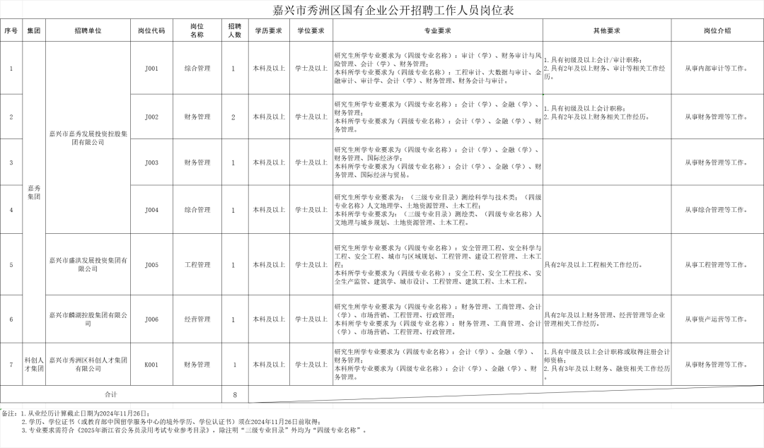 為(wèi)加強高(gāo)素質專業(yè)化(huà)國(guó)有(yǒu)企業(yè)人(rén)才隊伍建¶設,嘉興市(shì)嘉秀發展投資控股集團有(yǒu)限公司、嘉興市(shì)盛洪發展投資集團有(yǒu)限公司、嘉興市(shì)麟湖(hú)控股集團有(yǒu)限公司¶、嘉興市(shì)秀洲區(qū)科(kē)創人(rén)才集團有(yǒu)限公司現(xiàn)面向社會(huì)公開(kāi)招聘工(gōng)作(zuò)人(rén)員(∑yuán),具體(tǐ)公告內(nèi)容如(rú)下(xià):